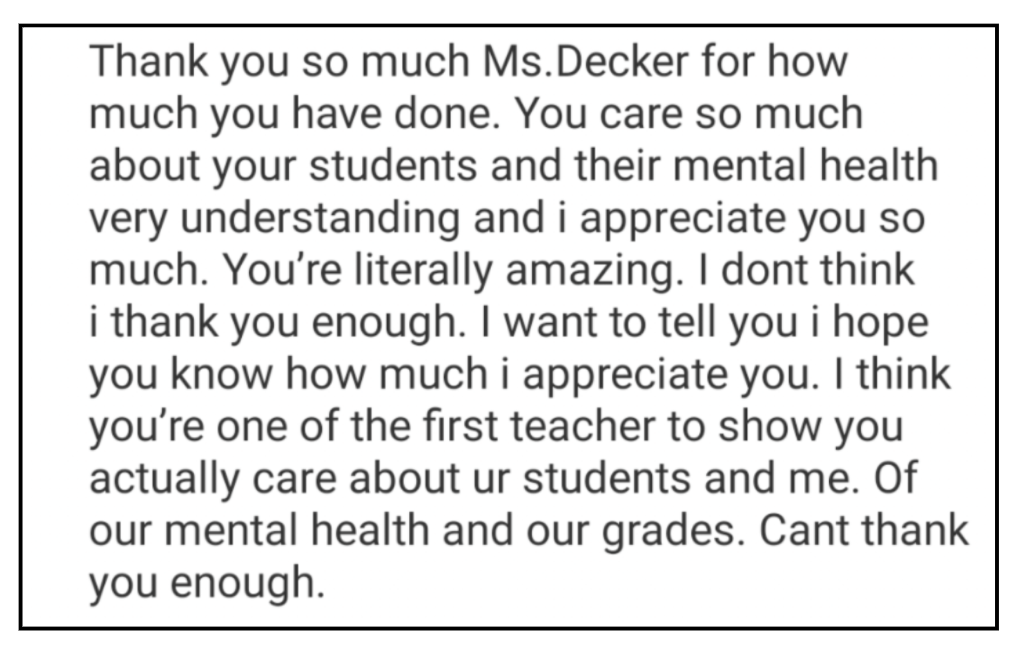 I’m trusting that I’m doing something right. It feels more difficult to believe it every day no matter how much I hype myself up. And then I’m in the middle of trying not to have a meltdown about this or that (35 million assignment submissions, questions about why I haven’t graded something that was turned in 13 minutes ago, the building’s AC not working even though it was replaced last summer), and a random note of kindness pops up at 9 AM.